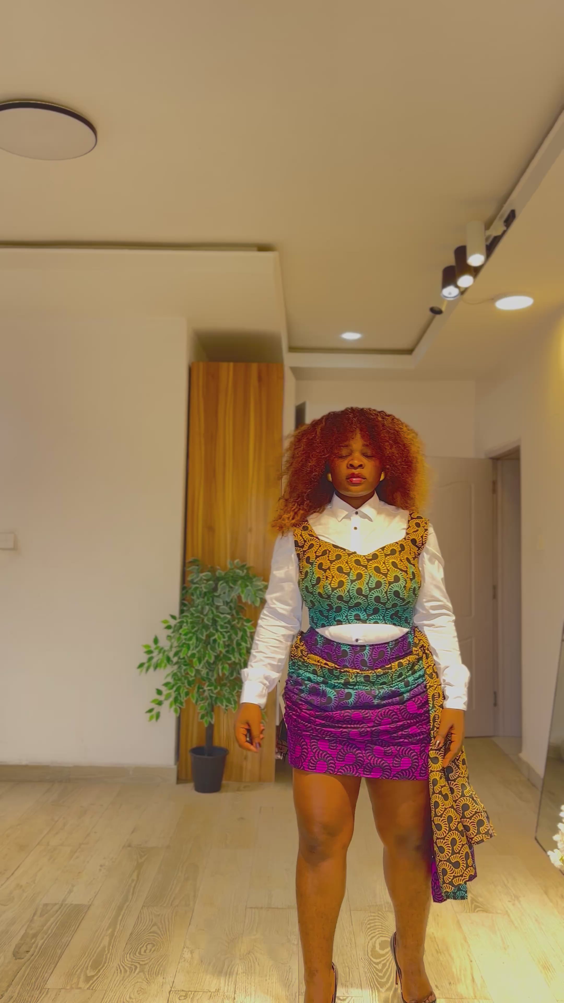 This striking two-piece set (comes with a white shirt) is crafted from richly patterned Ankara fabric, designed to celebrate bold color and sculptural form. The fitted crop top features a wide-strap neckline that frames the shoulders and décolletage with a clean, structured finish. Paired with a high-waisted mini skirt, the silhouette is elevated by a dramatic wrap drape that cascades asymmetrically to one side, creating movement and visual depth.